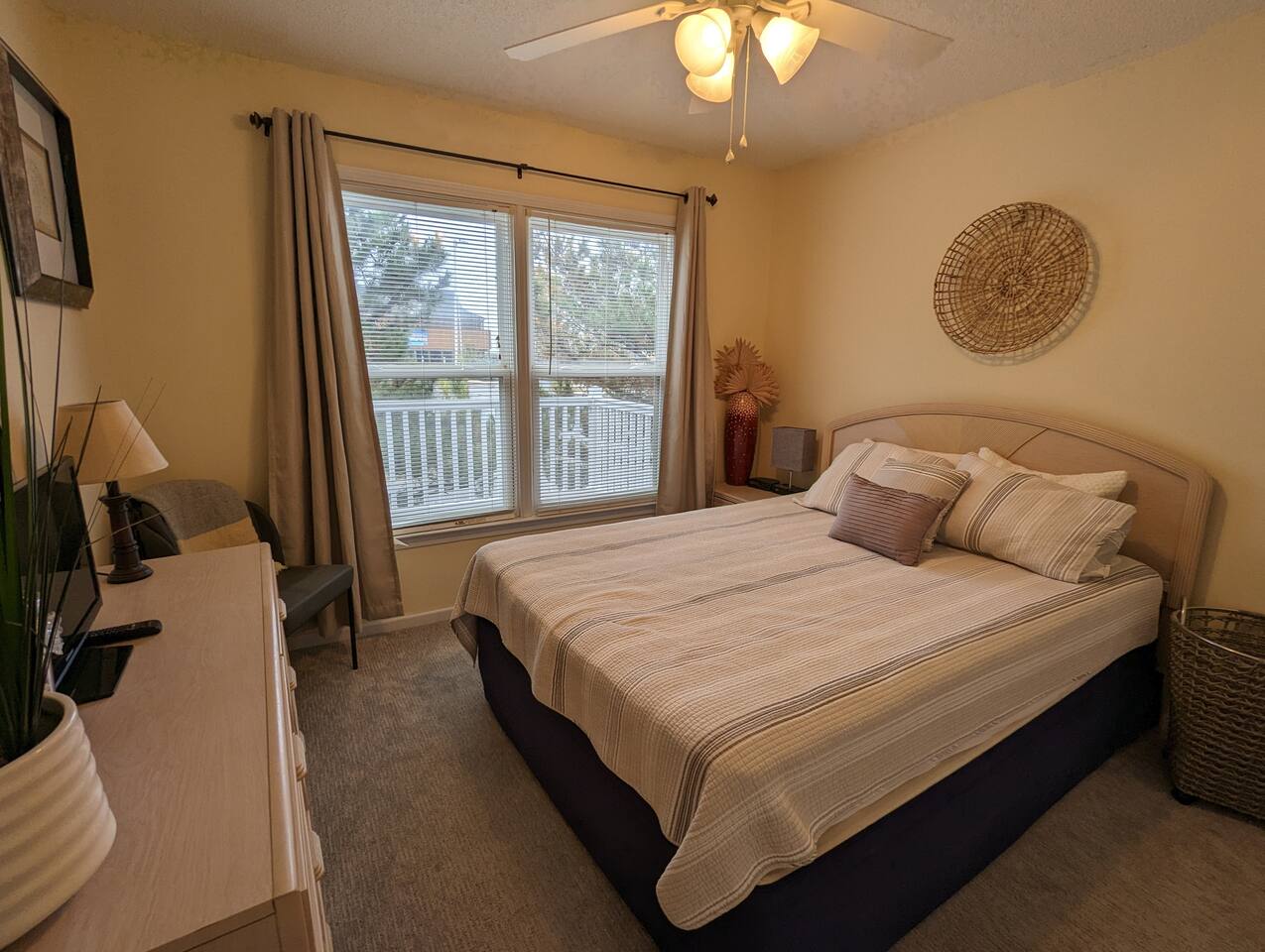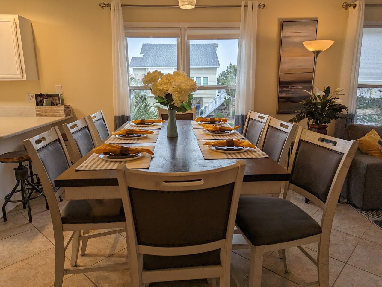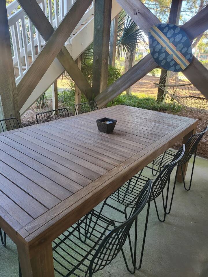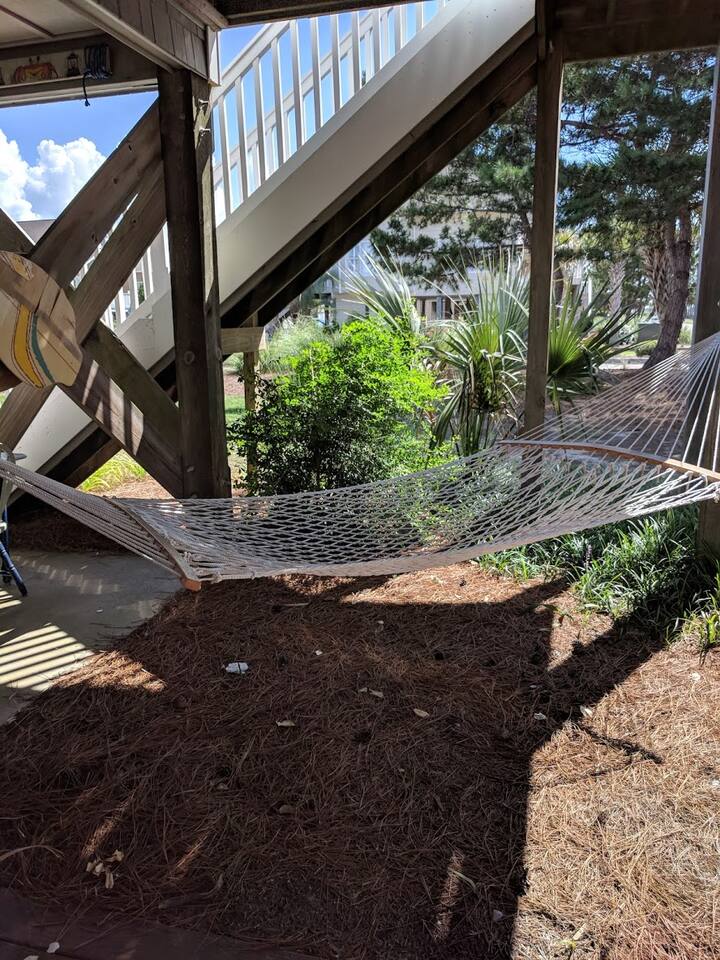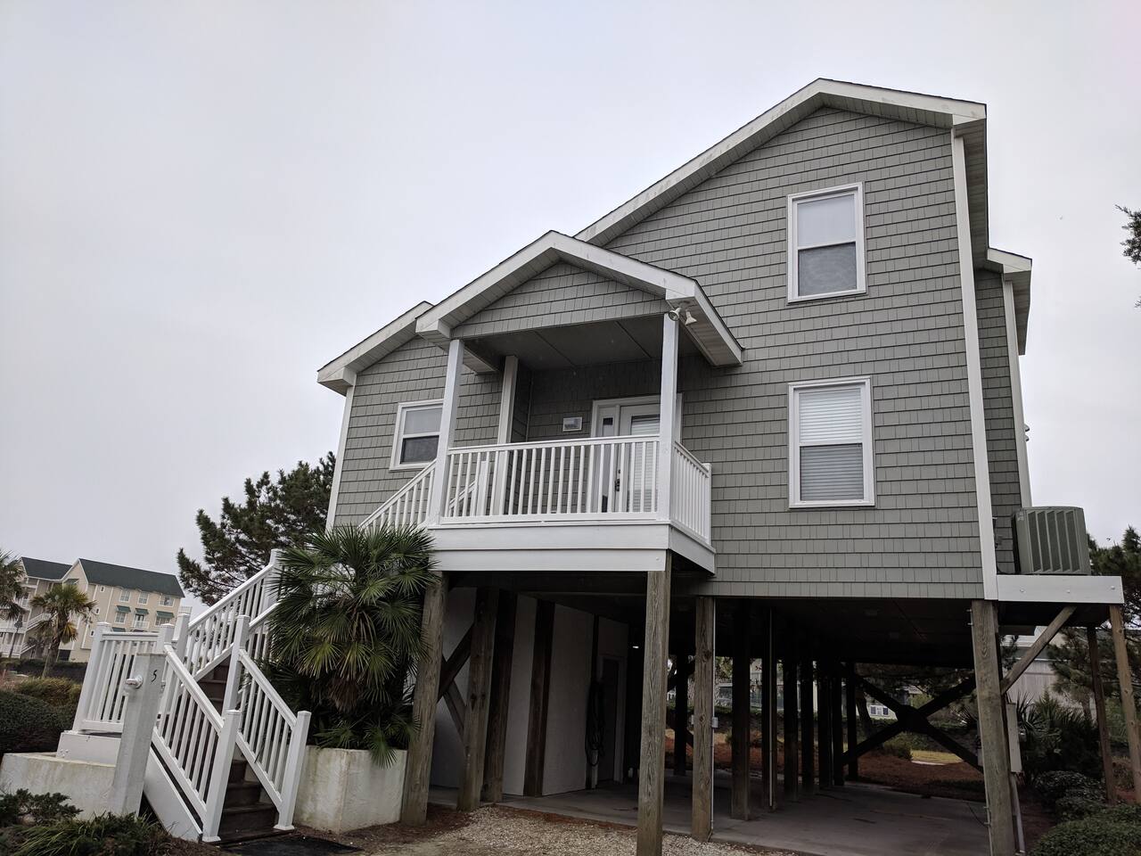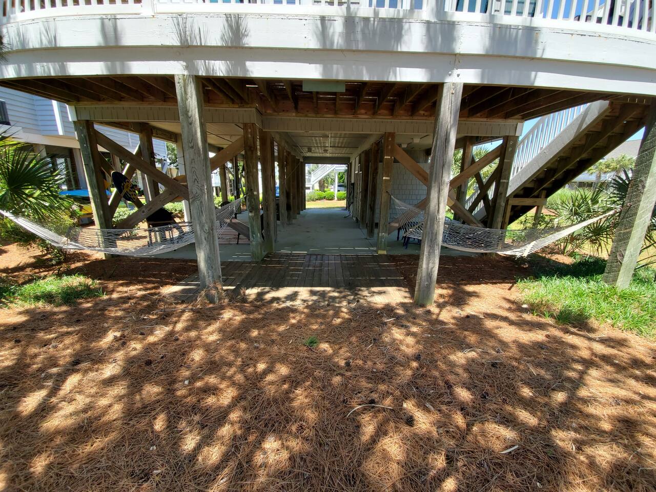 Welcome to your oasis of comfort and tranquility! Our home provides ample space for you to relax and unwind, both indoors and out. One of the many highlights of our property is the serene outdoor area located underneath the house. Complete with cozy hammocks, comfortable seating, a grill, and an outdoor table, this space is the perfect spot to spend quality time with loved ones in the fresh air. The area stays pleasantly cool, making it a fantastic place to kick back and soak up the beautiful surroundings. Additionally, there is an outdoor shower with a changing room, as well as a shed stocked with beach chairs, an umbrella, and even games such as cornhole! As you enter our fully-stocked kitchen on the first floor, you'll find all the supplies you need to prepare meals during your stay. The dining table seats 8, with an additional 3 seats at the counter. The large living area features a 65-inch TV with access to all your favorite streaming apps, as well as high-speed internet. We also have a dedicated work area to make your stay even more comfortable if you find you need to check some emails. Downstairs, there are two bedrooms, one with a king bed and one with a queen bed. These rooms are connected by a newly updated Jack and Jill bathroom with a beautiful tiled shower. Additionally, there is a half bath on the first floor for convenience (no one will have to enter someone's bedroom to use the bathroom). The living room opens up to the porch, where you can enjoy the beautiful ocean breeze and comfortable seating. We have a wooden baby gate on the back porch to ensure your little ones stay safe. We also have a full-size washer and dryer in the unit for your use. Upstairs, you will find two more bedrooms connected by an updated Jack and Jill bathroom with a tub. One bedroom has a queen bed and the other has 2 twin beds and a full-size bunk bed. The queen room offers a limited ocean view. Three of our bedrooms have ceiling fans (excluding the bunk room), and we also provide a box fan for guests who prefer extra air or white noise. We aim to provide a variety of beach chairs, with a goal of having at least 8 fully functioning chairs. If you find any chairs that are unusable or in need of replacement, please reach out to us, and we will cover the cost of new chairs for your use during your stay. The same holds true for our umbrella and wagon, both of which are available for your convenience. We hope you enjoy your stay at our home and make wonderful memories with your loved ones!